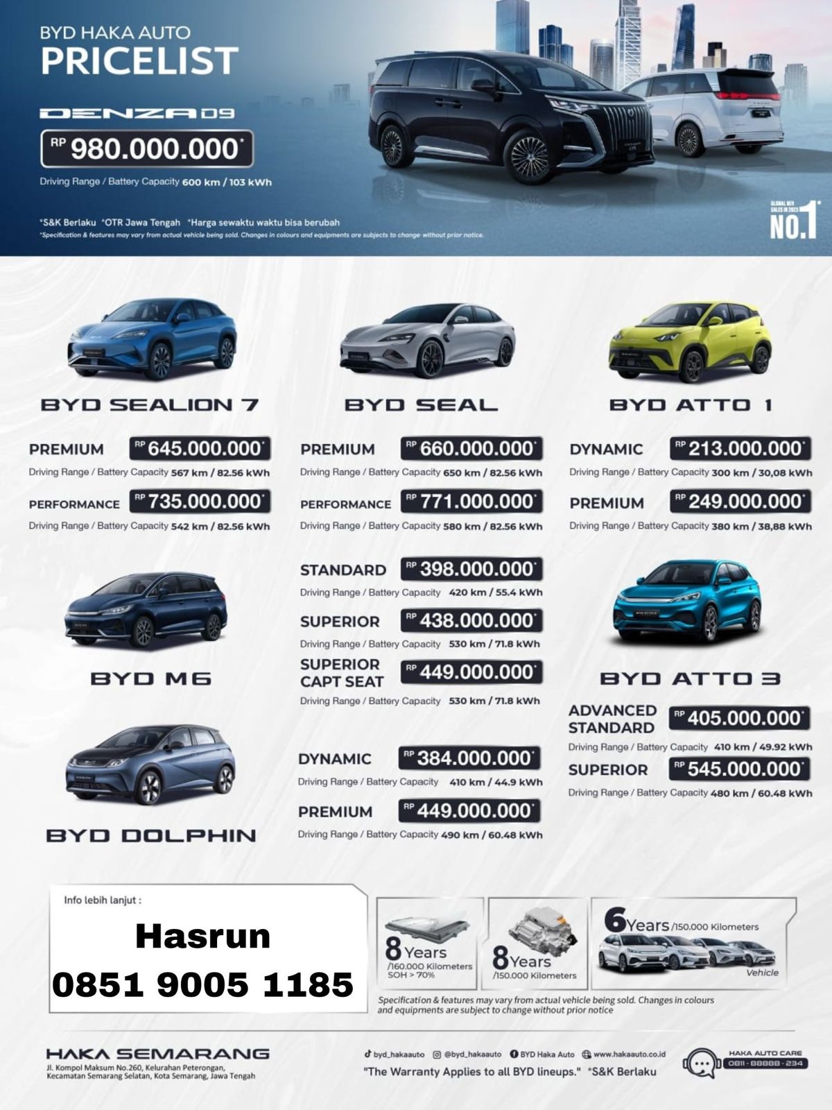 Selamat datang di Dealer Resmi BYD Haka Jawa Tengah. Kami hadir sebagai pusat penjualan resmi BYD dengan layanan terbaik, harga paling kompetitif, serta promo menarik untuk seluruh wilayah Jawa Tengah hingga Indonesia.